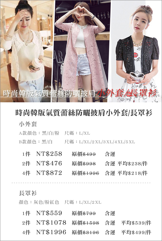 商品訊息簡述: 只要258元起(含運)即可享有原價最高3,196元時尚韓版氣質蕾絲防曬披肩小外套/長罩衫1件/2件/4件:(A)小外套,款式、顏色、尺碼任選/(B)長罩衫,顏色:灰色/粉紅色,尺碼:L/XL/2XL?