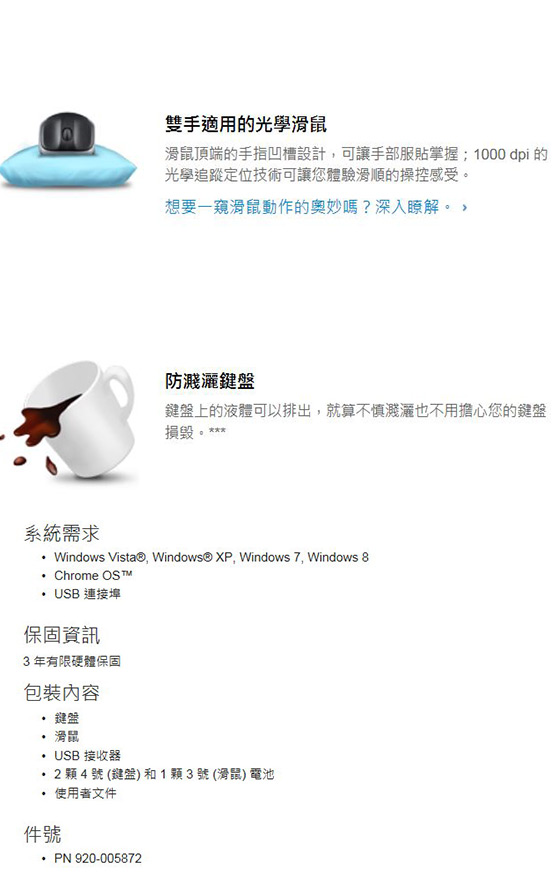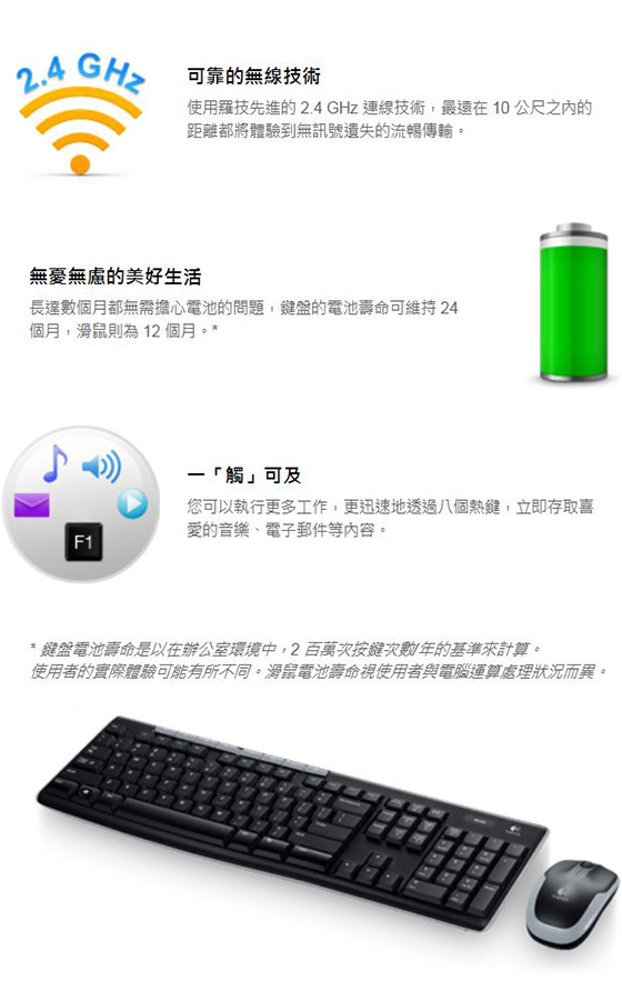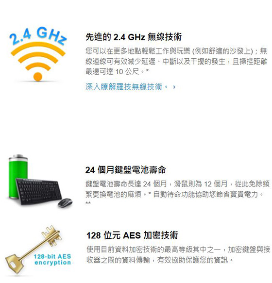 包裝內容:鍵盤*1 / 滑鼠*1 / USB 接收器*1 / 2 顆4 號(鍵盤) 和1 顆3 號(滑鼠) 電池/ 使用者文件*1